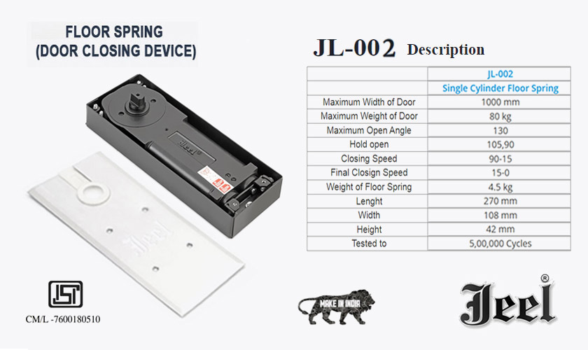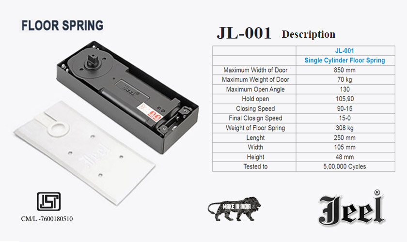 khodiyar Machine Tools Industries Being a quality centric our organization is actively engaged in providing a vast range of Floor Spring, Single Spring Floor Hinge, Concealed Floor Spring, Hydraulic Floor Spring, Glass Door Floor Spring, Hydraulic Patch, Hydraulic Patch Hinges, Door Control Devices, all type of Jeel Brand Floor Spring, Our Aluminium - Glass - Metal heavy duty weight capacity Door Floor Spring are Single Cylinder & Double Cylinder Floor Spring with varied door wt. capacity of 80kgs - 150kgs - 200kgs - 250kgs - 300kgs The floor springs are built with grey Cast Iron mechanism body and have high quality oil in them. can be (Frameless Glass Door Floor Spring) Jeel Brand It is fabricated by our professional in compliance with defined norms using premium quality raw material that is sourced from reliable vendor of the market as per the defined industry standards. Moreover, these are available at industry leading best prices to the our clients.